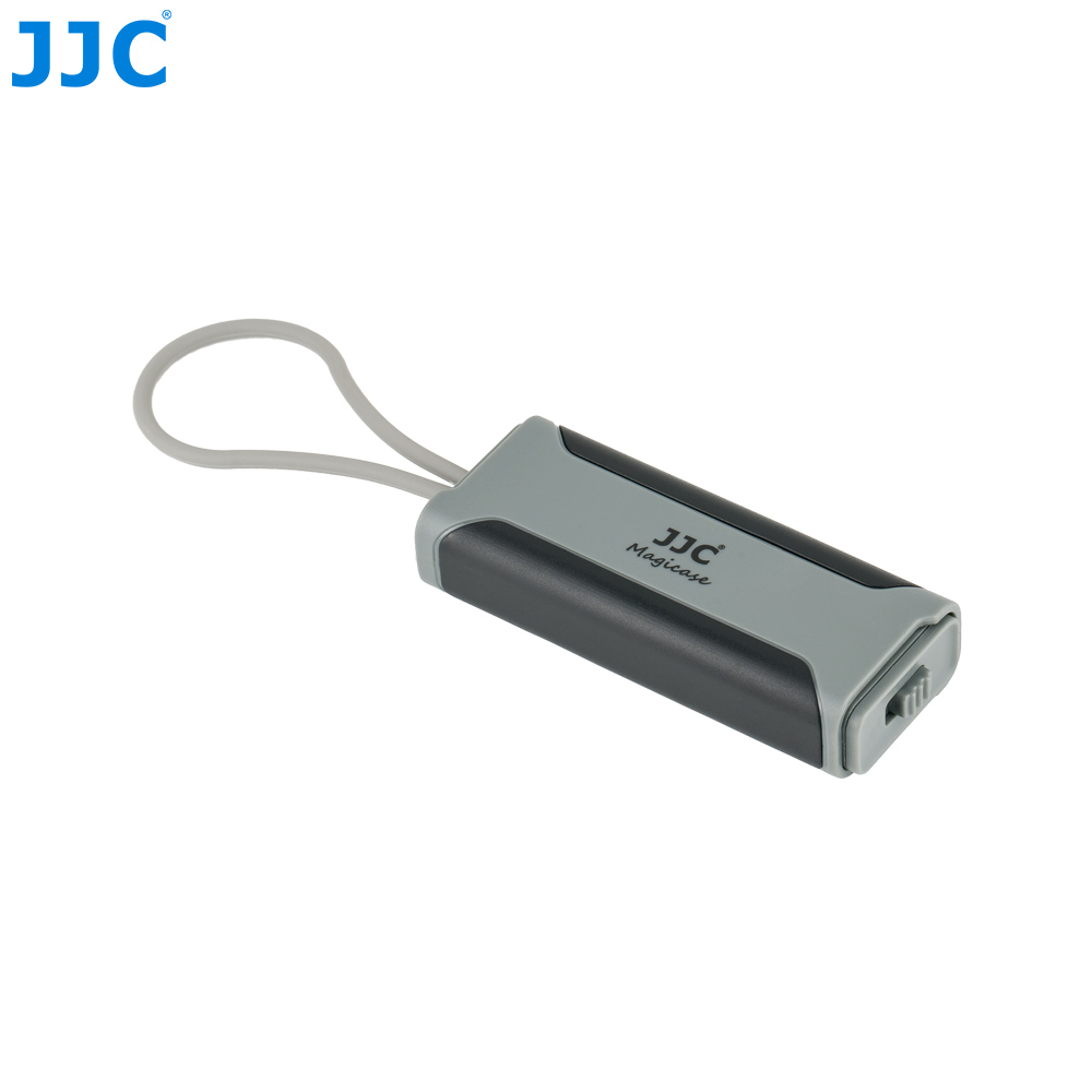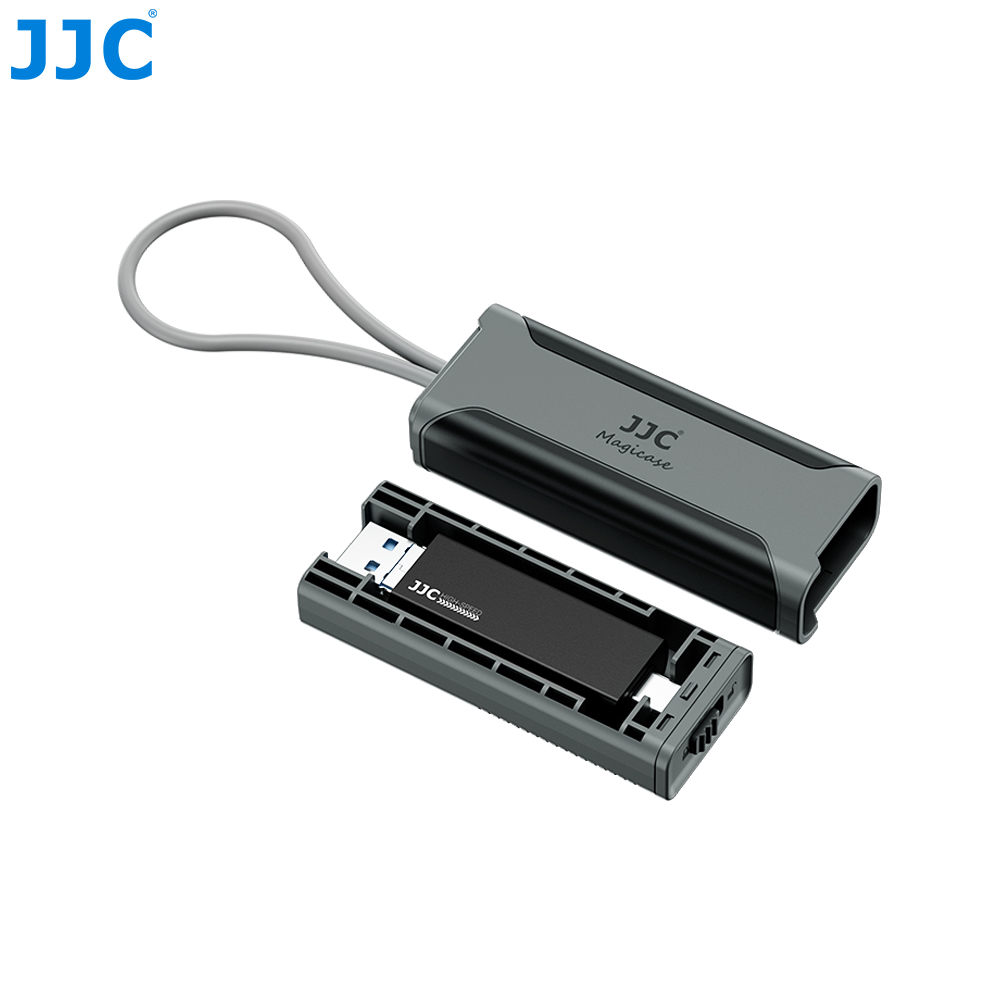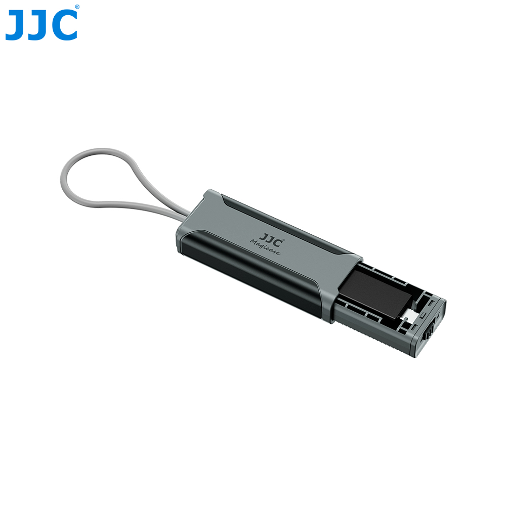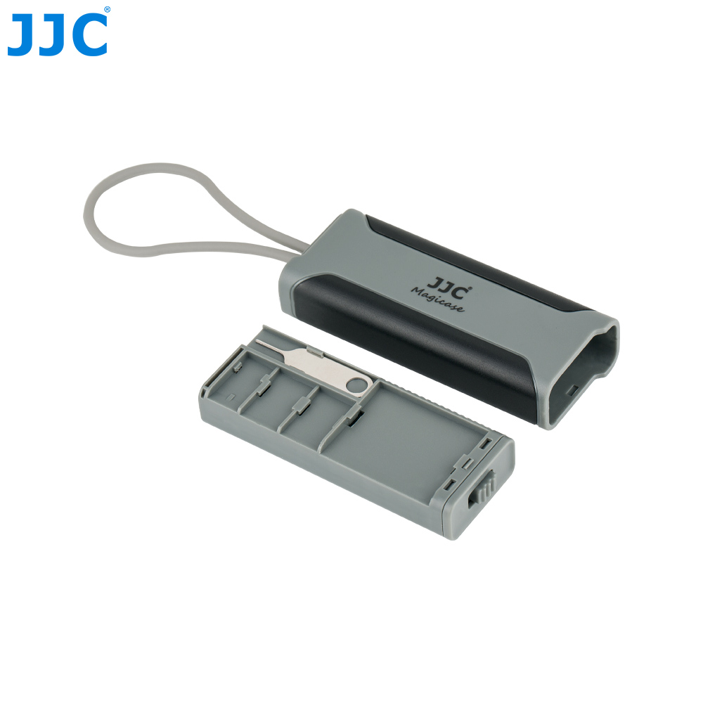 JJC MCR-STM5系列闪存卡收纳盒由优质环保ABS材料制成,坚固耐用,多色可选。可收纳1张SD卡,2张TF卡,1张Nano SIM卡,1个USB 3.0多功能读卡器以及1枚取卡针。本款收纳盒可将零散的闪存卡整齐收纳,有效保护闪存卡免于灰尘及丢失。收纳盒分为收纳槽和外壳。收纳槽一面为定制成型卡槽精心呵护您的闪存卡,且卡槽两端带扣位设计固定卡片以防掉落。另一面为读卡器收纳槽,可用于收纳附赠的USB 3.0多功能读卡器1。使用时,将收纳槽尾端的解锁推扭向解锁图标一侧推动,收纳槽即可自动弹出。使用后,把收纳槽塞入外壳,一推到底即可锁住收纳槽。收纳盒小巧便携,可轻松置于口袋、手提包或背包中。也可通过卡盒上方的弹性硅胶绳进行携带。本款集存卡读卡一体式设计的收纳盒将成为您卡片管理和数据存取的好帮手。