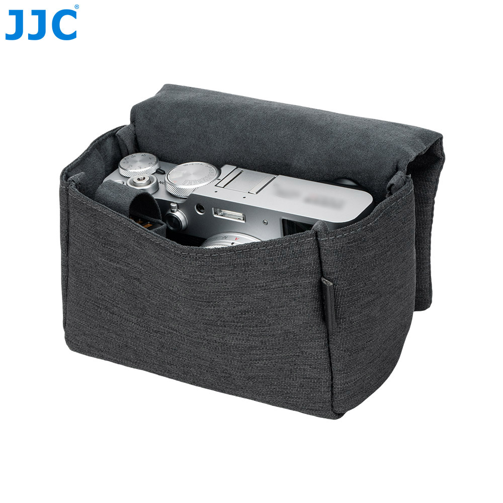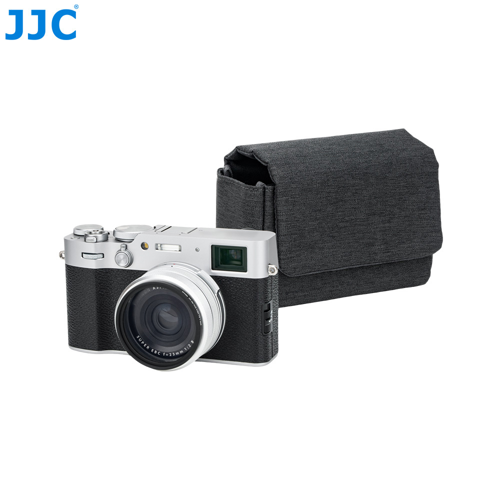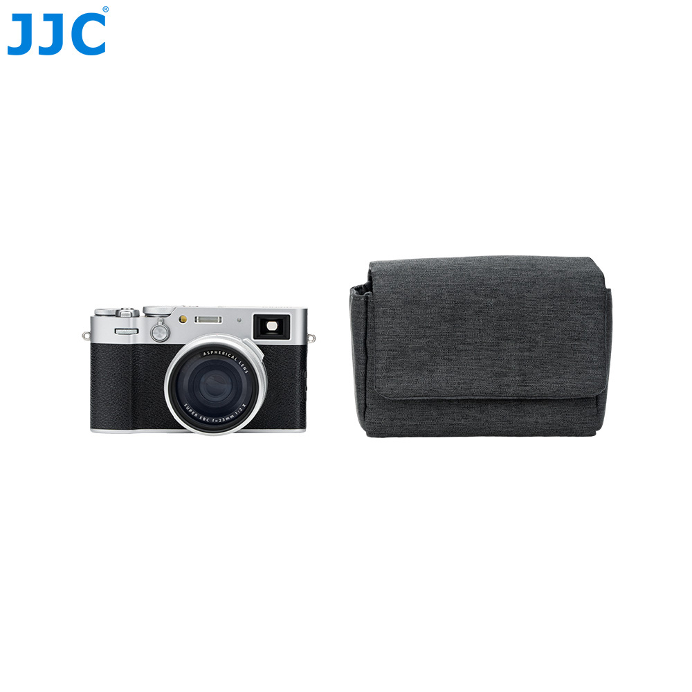 JJC CB-M DGRAY相机包适用于富士X100VI, X100V,富士X-E5(搭配富士XF 23mm F2.8 R WR,XF 27mm f/2.8 R WR以及XF 27mm f/2.8镜头),佳能PowerShot V1等相机,可以储存并保护您的相机免于灰尘,颠簸、刮蹭以及轻微的撞击。磁吸式开合设计,取用相机更高效。相机包表面选用涤纶牛津布,高密度编织抗撕裂,适合日常频繁使用;内衬为仿皮绒,可有效防止刮擦,保护相机机身和镜头。相机包设有电池专用收纳袋,可用于存放电池;背面配有隐藏式口袋,方便收纳存储卡,读卡器和清洁布等。此相机包兼容相机肩带,不影响肩带的使用。