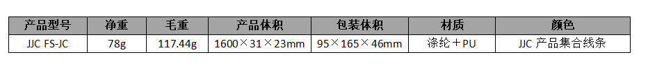 型号 图片 颜色 长度 规格 JJC FS-JC FrameStrap Curated Lines JJC产品集合线条 120cm-160cm 肩带宽度:31mm 编织绳直径:6.5mm 绳结厚度:23mm 承重:25kg