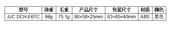 CAN. LP-E6/LP-E6N JJC B-LPE6 | 输入:DC 5V⎓2.2A (Min) 输出:DC 8.4V⎓600mA 尺寸:80 x 58 x 25mm 材质:ABS |