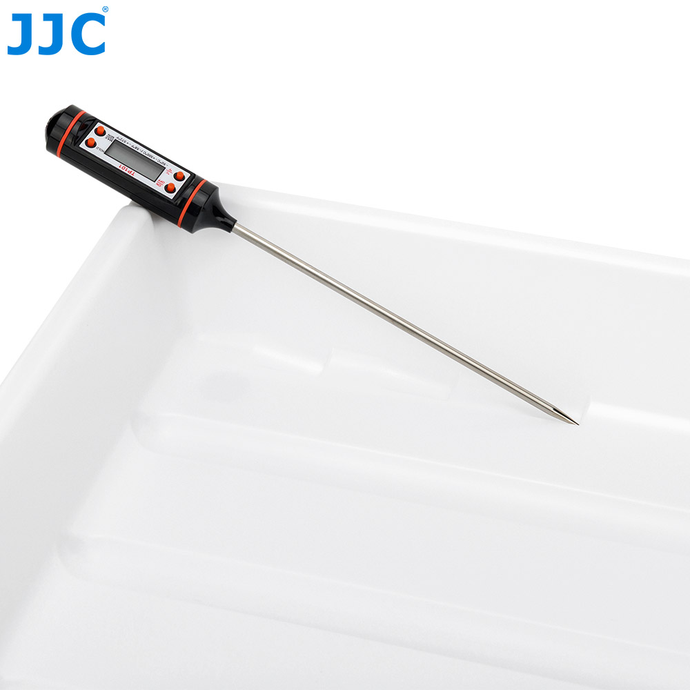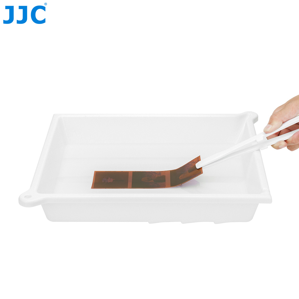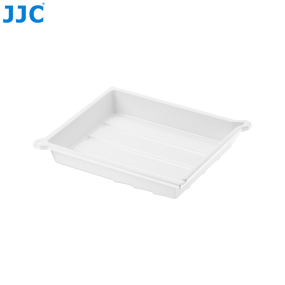 JJC DT-1012系列显影盘适用于冲洗照片和胶片,采用高品质聚丙烯(PP)材质制成,具备良好的耐热性与一定的抗酸碱能力,是胶片冲洗过程中不可或缺的辅助工具。显影盘内壁光滑细腻,可避免刮伤底片或相纸表面,保障影像品质。底部采用凹槽设计,便于用户快速取出相纸。显影盘底部特设温度计固定凹槽,用户可将温度计稳妥放置,随时掌握液体温度,确保冲洗效果稳定可靠。JJC DT-1012系列显影盘附带一个硅胶夹,便于操作过程中夹取相纸或底片,避免手部直接接触化学液体,提升安全性。底部配备四个防滑硅胶垫,在使用过程中增强稳固性,防止打滑倾倒。显影盘侧边设计有挂钩孔与排液口,使用完毕可悬挂收纳节省空间,排液操作也更加快捷高效。显影盘共提供三种颜色可选——红色、灰色和白色,用户可根据不同冲洗工序进行颜色区分,有效避免交叉污染。