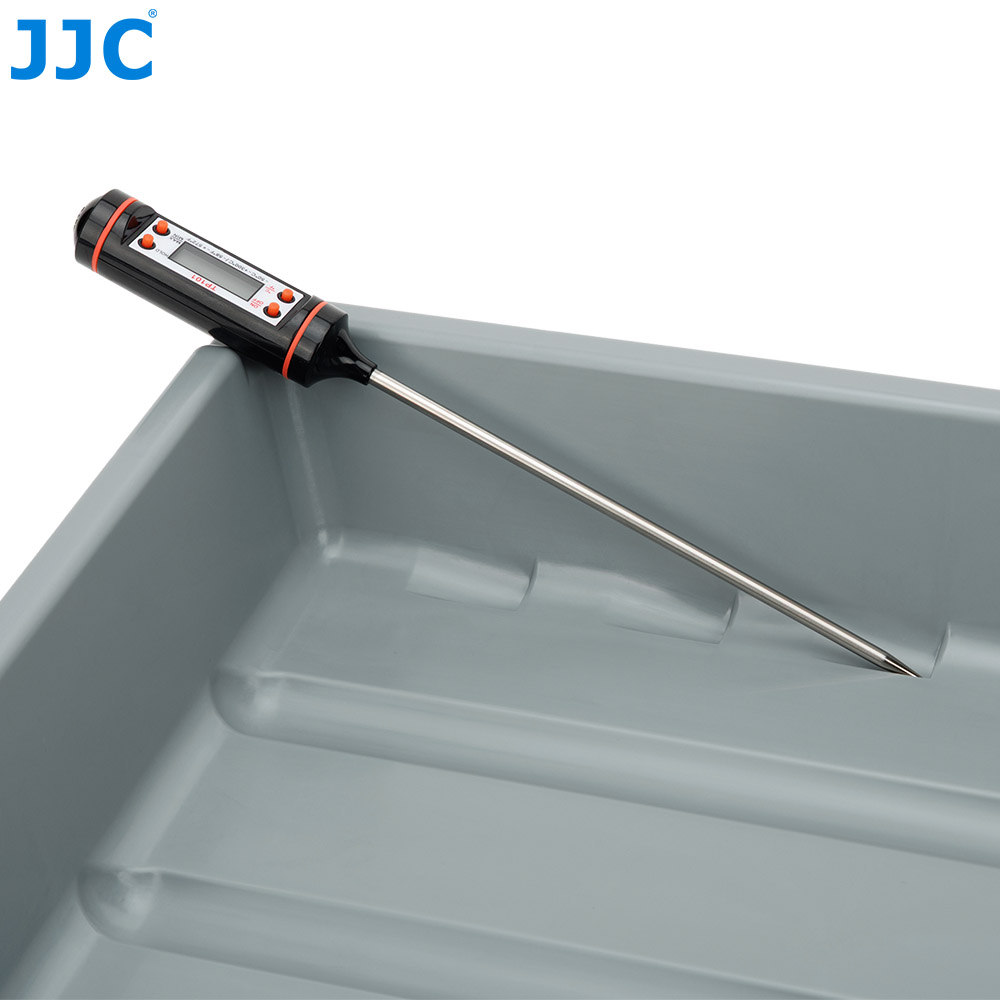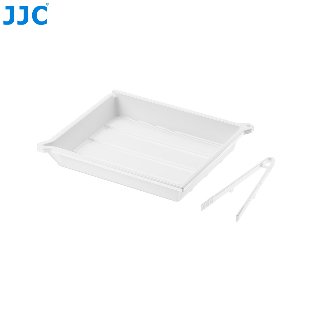 JJC DT-1012系列显影盘适用于冲洗照片和胶片,采用高品质聚丙烯(PP)材质制成,具备良好的耐热性与一定的抗酸碱能力,是胶片冲洗过程中不可或缺的辅助工具。显影盘内壁光滑细腻,可避免刮伤底片或相纸表面,保障影像品质。底部采用凹槽设计,便于用户快速取出相纸。显影盘底部特设温度计固定凹槽,用户可将温度计稳妥放置,随时掌握液体温度,确保冲洗效果稳定可靠。JJC DT-1012系列显影盘附带一个硅胶夹,便于操作过程中夹取相纸或底片,避免手部直接接触化学液体,提升安全性。底部配备四个防滑硅胶垫,在使用过程中增强稳固性,防止打滑倾倒。显影盘侧边设计有挂钩孔与排液口,使用完毕可悬挂收纳节省空间,排液操作也更加快捷高效。显影盘共提供三种颜色可选——红色、灰色和白色,用户可根据不同冲洗工序进行颜色区分,有效避免交叉污染。