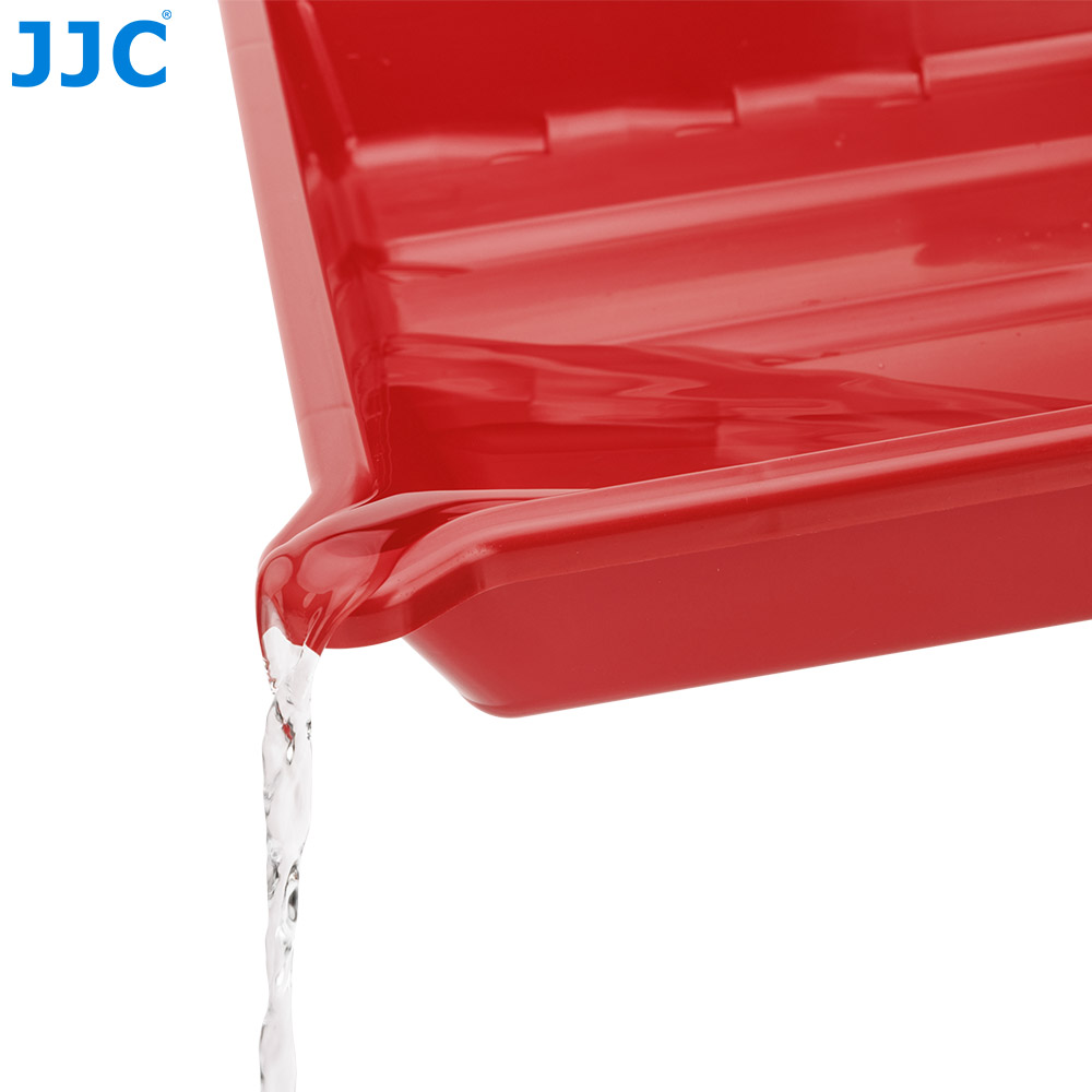 JJC DT-1012系列显影盘适用于冲洗照片和胶片,采用高品质聚丙烯(PP)材质制成,具备良好的耐热性与一定的抗酸碱能力,是胶片冲洗过程中不可或缺的辅助工具。显影盘内壁光滑细腻,可避免刮伤底片或相纸表面,保障影像品质。底部采用凹槽设计,便于用户快速取出相纸。显影盘底部特设温度计固定凹槽,用户可将温度计稳妥放置,随时掌握液体温度,确保冲洗效果稳定可靠。JJC DT-1012系列显影盘附带一个硅胶夹,便于操作过程中夹取相纸或底片,避免手部直接接触化学液体,提升安全性。底部配备四个防滑硅胶垫,在使用过程中增强稳固性,防止打滑倾倒。显影盘侧边设计有挂钩孔与排液口,使用完毕可悬挂收纳节省空间,排液操作也更加快捷高效。显影盘共提供三种颜色可选——红色、灰色和白色,用户可根据不同冲洗工序进行颜色区分,有效避免交叉污染。