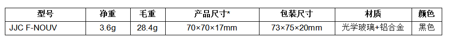 型号 包装内含 图片 JJC F-NOUV UV滤镜 ×1 超细纤维清洁布 ×1 滤镜收纳盒 ×1