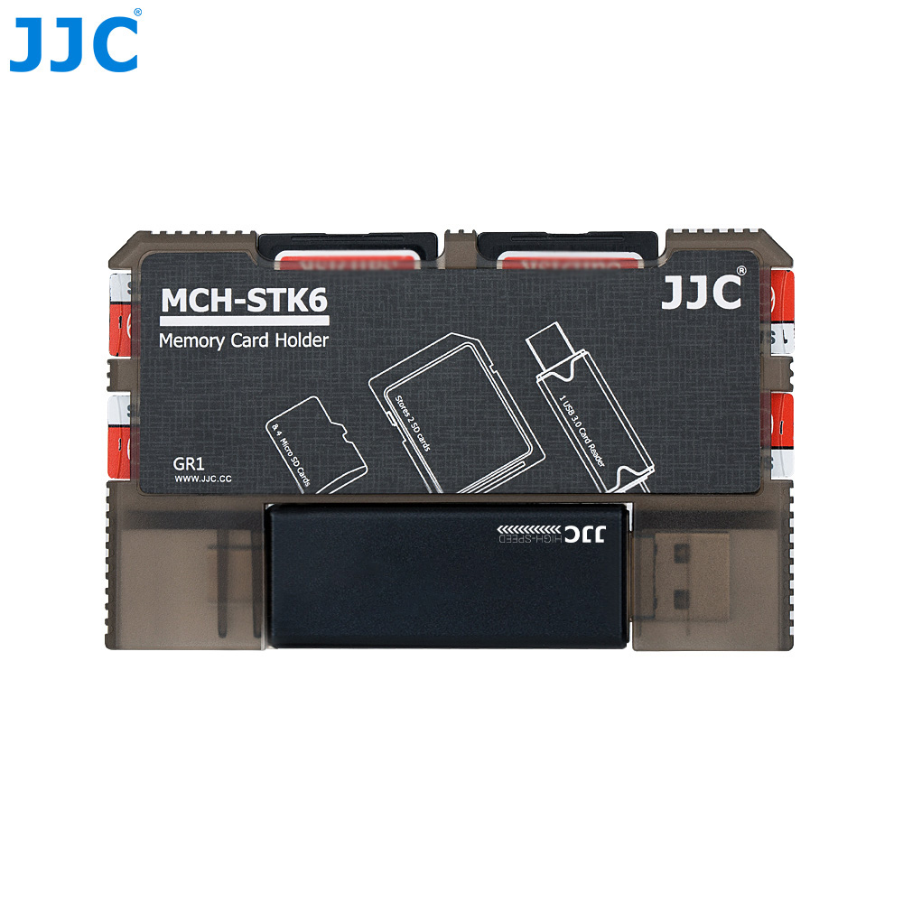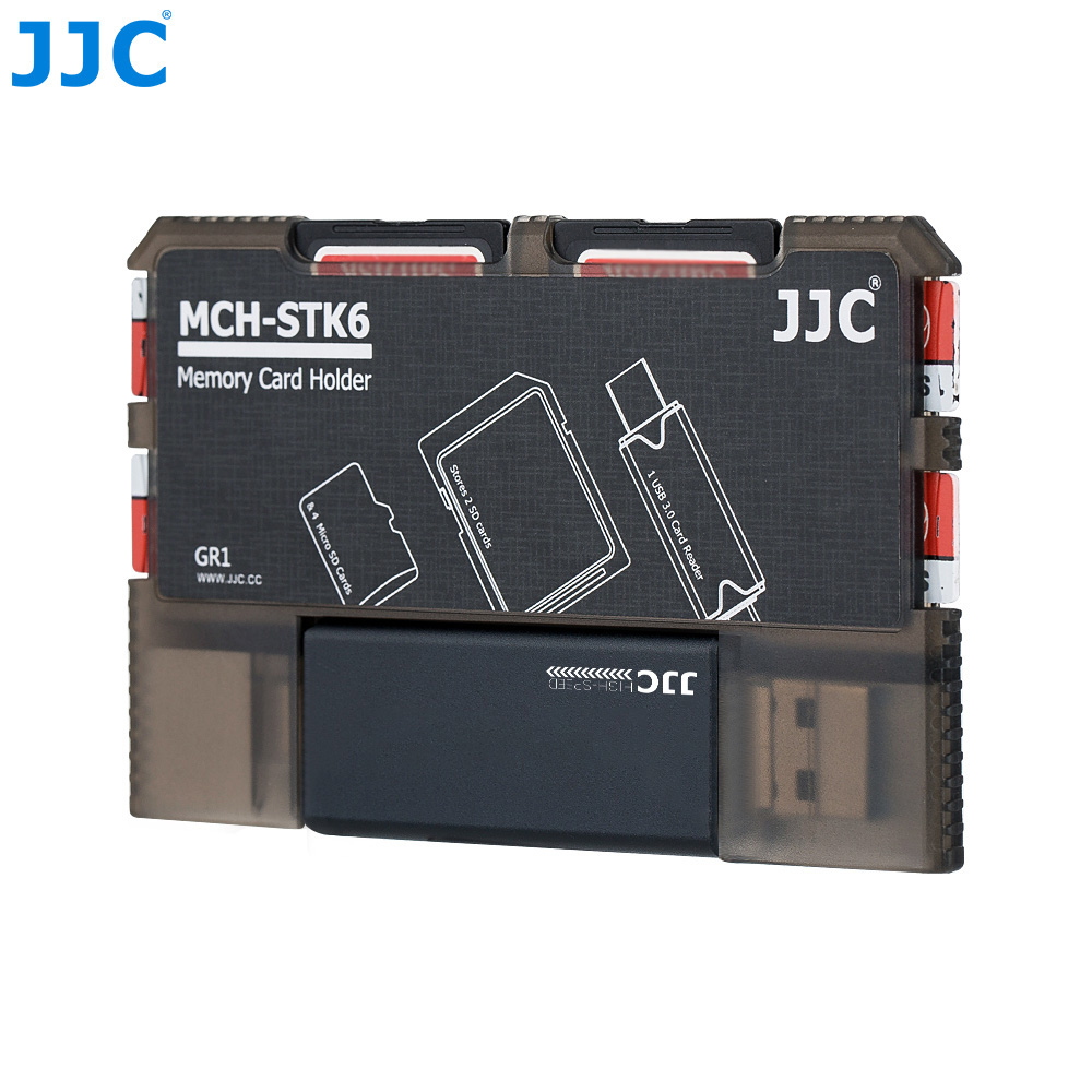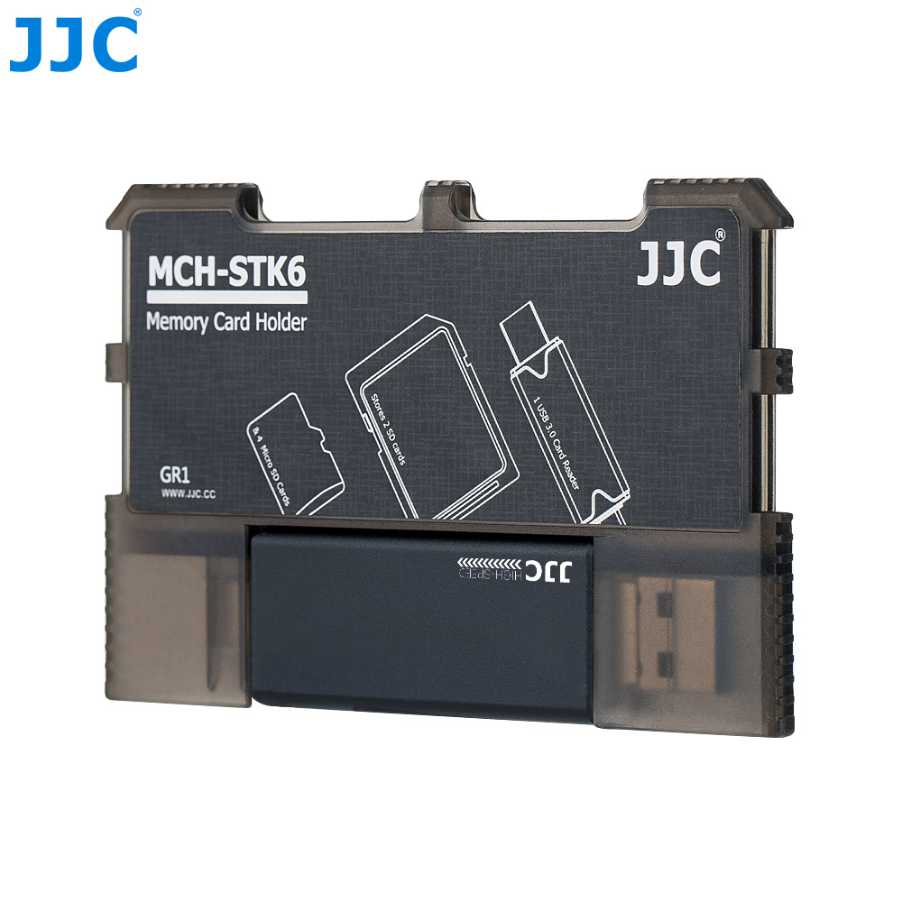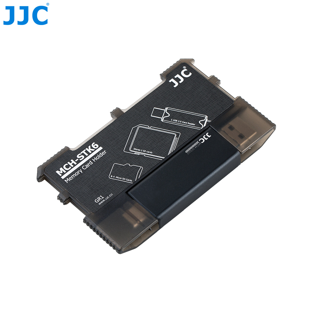 JJC MCH-STK6GR储存卡收纳盒由优质ABS材料制成,坚固耐用。可收纳2张SD卡,4张MSD卡及1个USB 3.0读卡器。可将零散的储存卡整齐收纳,有效保护储存卡免于灰尘及丢失。收纳盒卡槽内带弹性扣位,可固定住卡片使其免于掉落。背面带储存卡图案,便于使用及标记。使用时可根据贴纸上的储存卡图案轻松将卡准确无误地插入,方便快捷,免于重复拔插。还可在图案上对对应的卡片进行标注,方便管理卡片。此外,本款收纳盒附赠USB 3.0读卡器一个,带3个端口:USB 3.0, Micro USB 2.0及Type-C USB 3.0。高速数据传输,即插即用设计,可同时读取SD及MSD卡。收纳盒约银行卡尺寸大小,轻巧便携,可轻松置于口袋、手提包或背包中。本款集存卡读卡一体式设计的收纳盒将成为您卡片管理和数据存取的好帮手。