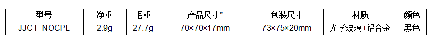 型号 包装内含 图片 JJC F-NOCPL CPL滤镜 ×1 超细纤维清洁布 ×1 滤镜收纳盒 ×1