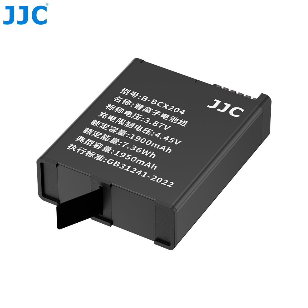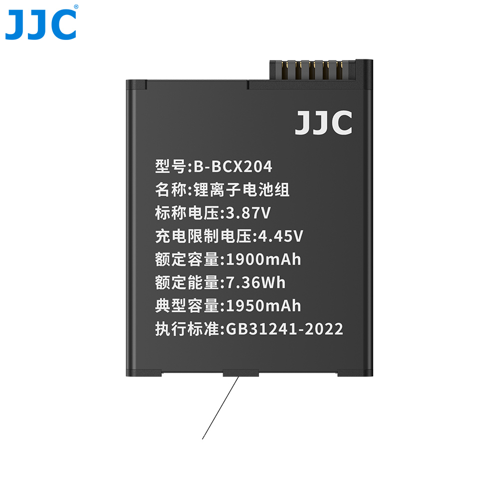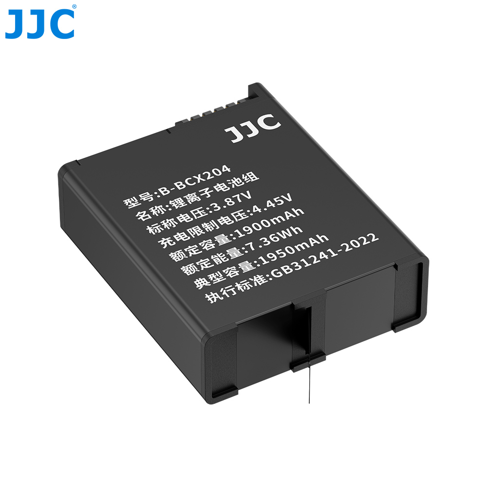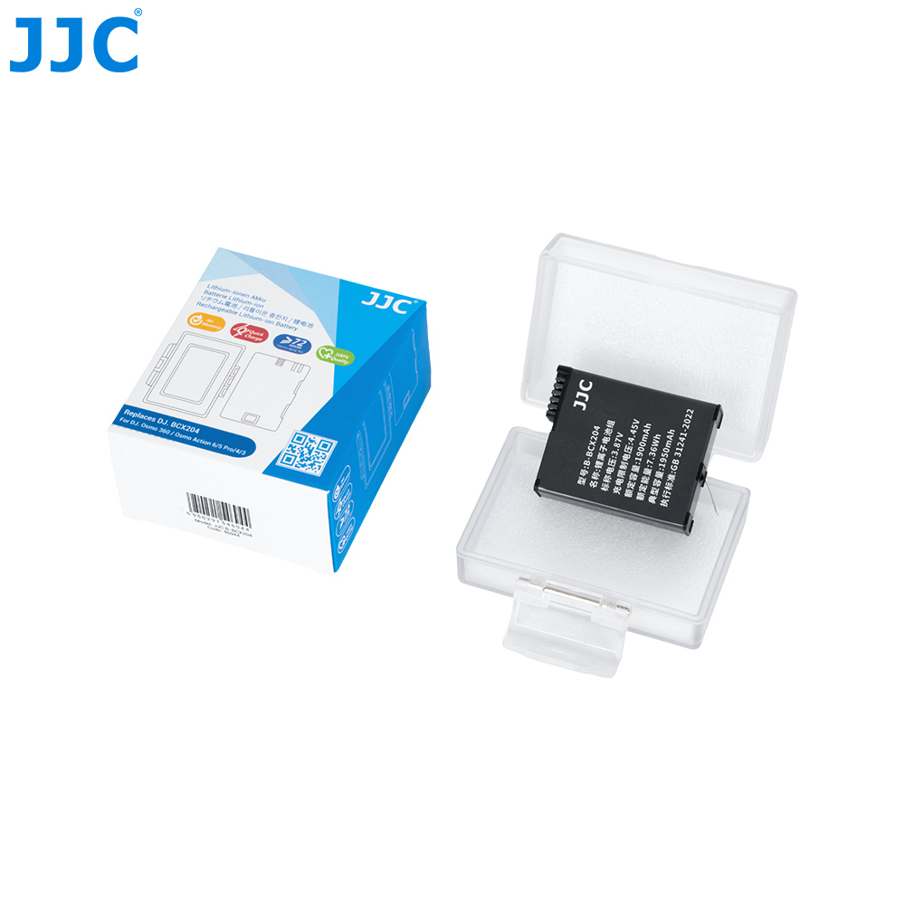 JJC B-BCX204锂电池,适用于大疆Osmo 360和Osmo Action 6 / 5 Pro / 4 / 3,功能与原装电池一致,能够良好适配对应机型。电池采用优质电芯,电量充足、续航持久、使用寿命长,同时搭载多重电路保护,包括过充保护、过流保护、短路保护。每一块电池均执行严格的品控标准,并经过 72 小时老化测试,以确保其性能稳定可靠。锂电池无记忆效应,支持随用随充,日常使用更加便捷。包装内附赠电池收纳盒,不使用时可将电池收纳其中,有效防尘、防潮、防水溅,进一步延长电池使用寿命。本电池已通过 3C 认证,安全可靠,为你带来安心的摄影体验。本产品可替代大疆BCX204电池使用。