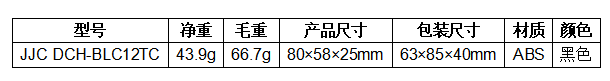 DCH-BLC12TC | PAN. DMW-BLC12 SIG. BP-51 LEI. BP-DC12 JJC B-DMWBLC12 | 输入: DC 5V⎓2.2A (Min) 输出: DC 8.4V±0.15V⎓600mA±50mA ×2 尺寸: 80 x 58 x 25mm 材质: ABS |